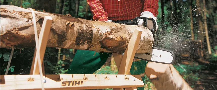 Это самая объемная часть работы. Обязательно используйте козлы. Пилить на земле — портить цепь. В нижней части ствола всегда есть песок, грязь, камни. Один контакт с землей — и цепь тупится моментально.