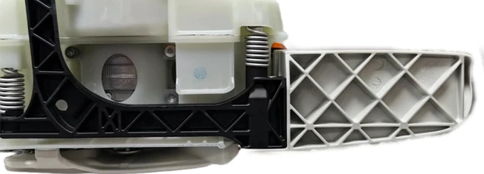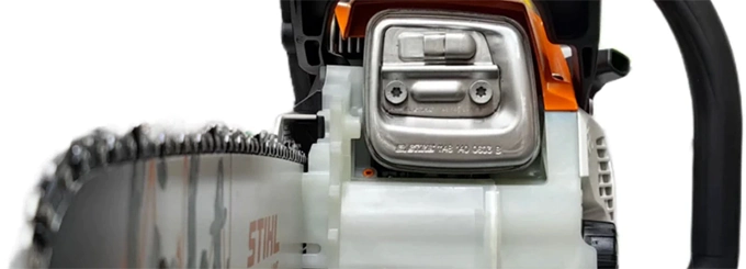 Корпус из высокотехнологичного полимера устойчив к ударам и коррозии, при этом легкий. Фильтрующий элемент из нетканого материала служит долго, интервалы обслуживания увеличены. Тормоз QuickStop останавливает цепь при нажатии на передний упор или автоматически при сильной отдаче. Это снижает риск травм при отскоке шины.